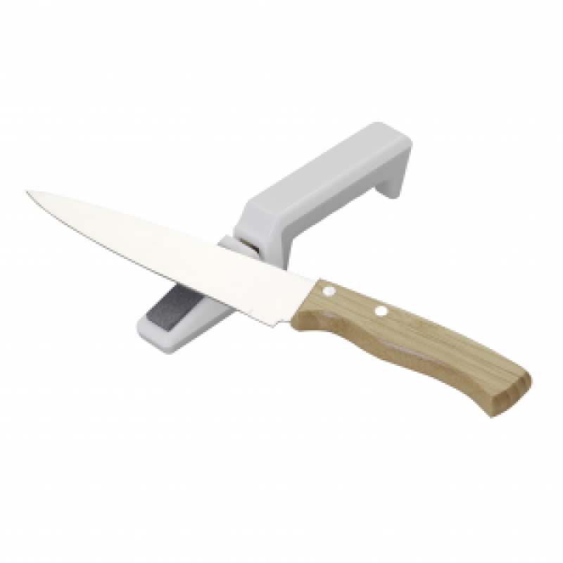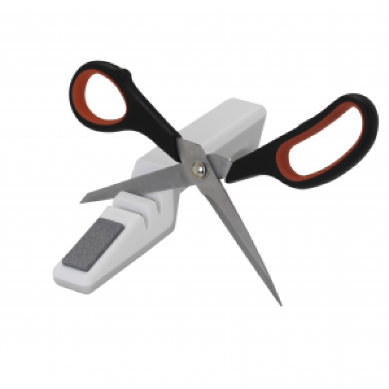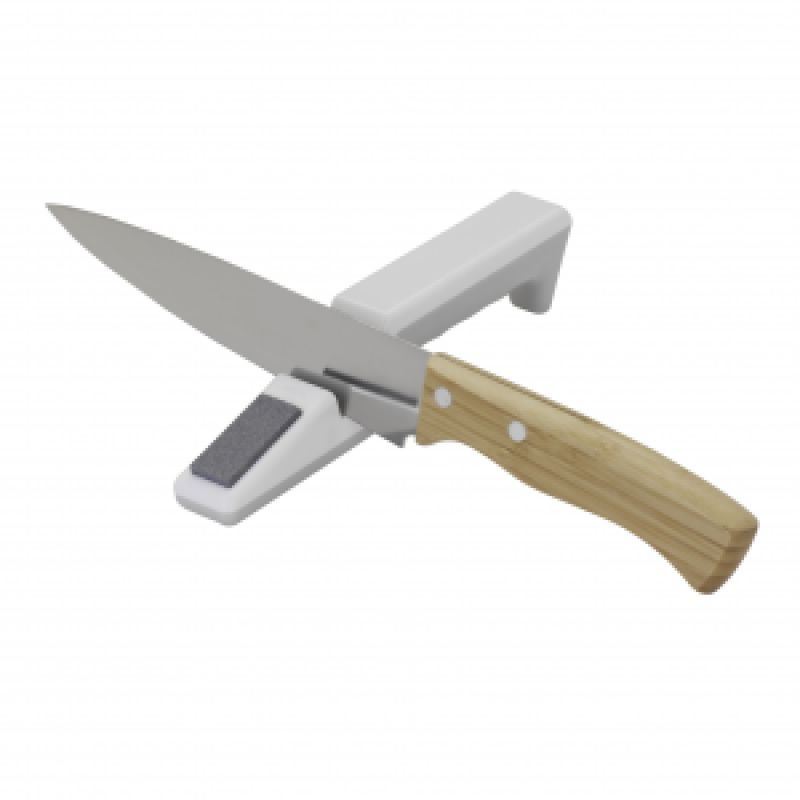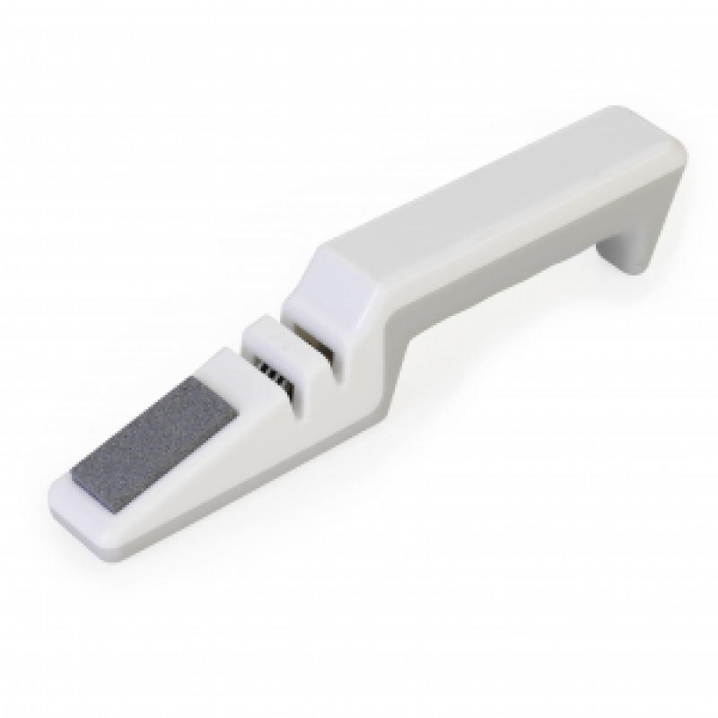 Afiador em plástico branco com 2 opções de afiação e uma polia na extremidade para desbaste e acabamento.