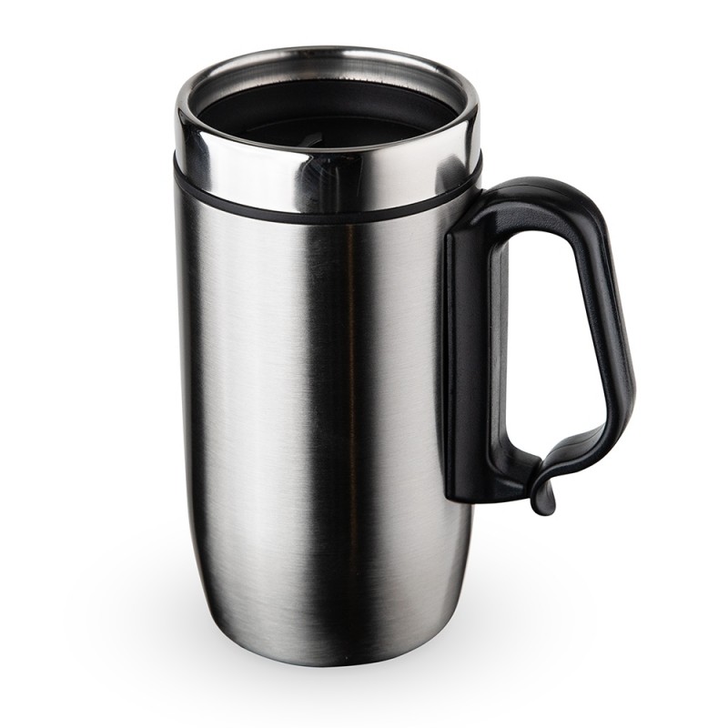 Caneca 275 ml parede dupla em Inox, com pegador de plástico, contém tampa com compartimento que ao deslizar, pode ser aberto para beber e base com EVA antiderrapante.