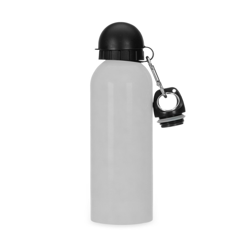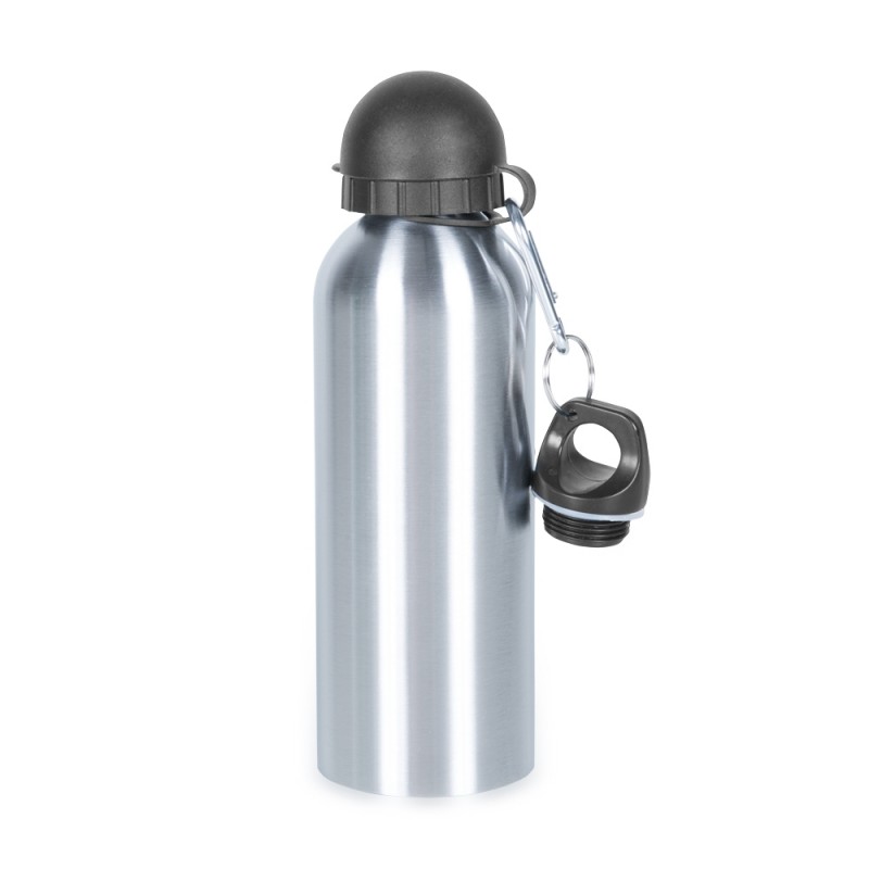 Squeeze 500ml de inox com pintura metalizada, tampa rosqueável e acompanha um segundo bico com mosquetão (não é térmico).