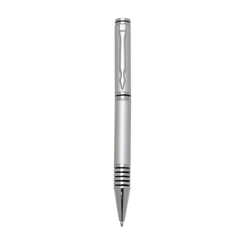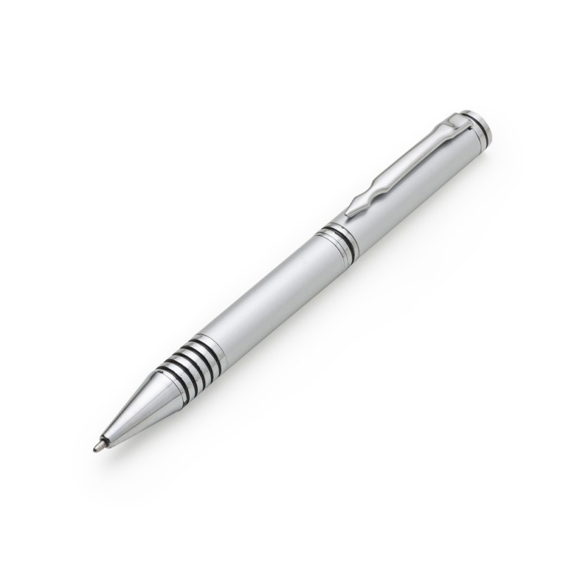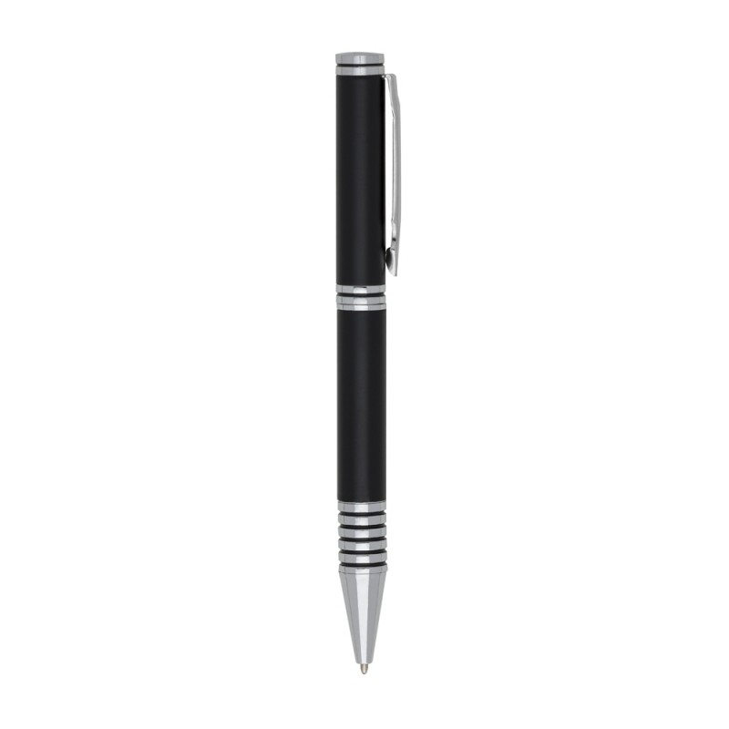 Caneta metal inteira colorida com detalhes prata. Clip metal, possui anel preto em relevo na parte superior e no centro. Seis anéis prata na parte inferior com um detalhe preto. Aciona por giro.