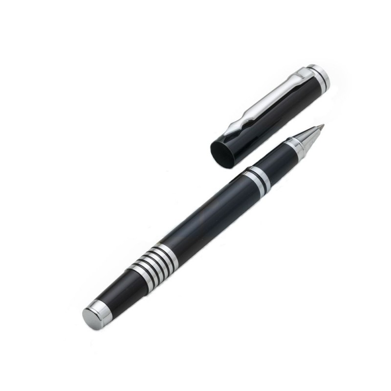 Caneta metal roller com tampa inteira colorida com detalhes prata. Clip metal, possui anel preto em relevo na parte superior e no centro. Seis anéis prata na parte inferior com um detalhe preto.