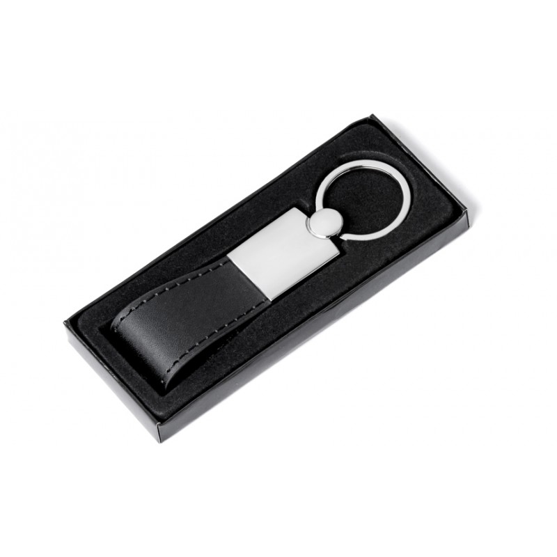 Chaveiro Chaveiro de metal com alça em couro sintético preto em formato trapézio + caixa com berço aveludado